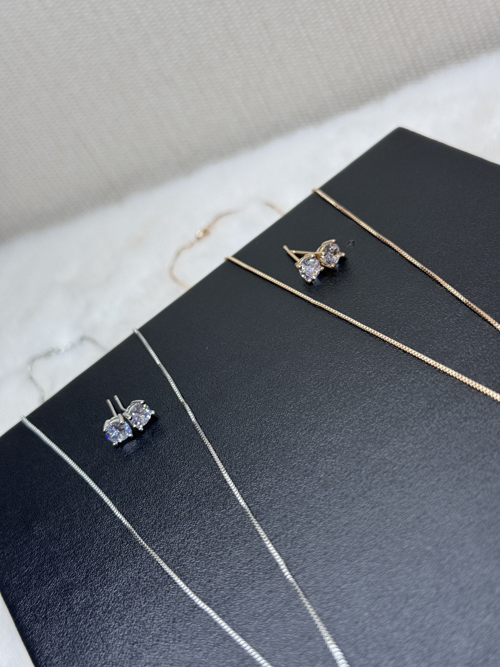 Conjunto de brinco e colar solitário. Aquele básico chic que adoramos, super essencial. Comprimento colar: 45cm. Tamanho do brinco e pingente do colar: 0.5cm.
